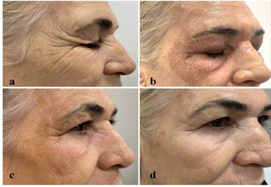 Participante GE (a) Antes (b) Após ablação, eritema, edema e crostas (c) discromia transitória- hiperpigmentação 15 dias após ablação (d) Melhora na textura da pele, rugas atenuadas 6 meses após a segunda sessão com eletrodo safe needle.