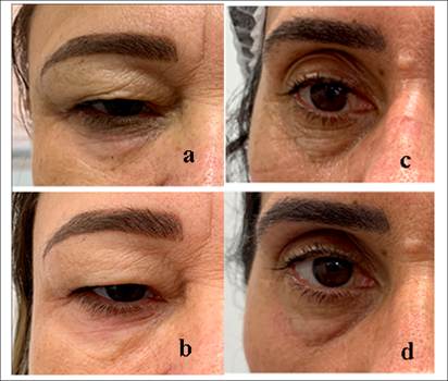 The procedure was well tolerated by all participants, who reported no pain, erythema, or peeling. Using the Safe Needle ablative electrode, 53.8% of patients reported mild pain, 46.2% moderate pain, with no reports of severe pain. The adverse effects of erythema, edema, and crusting were observed in 100% of the participants in the study group. Re-epithelialization with normalization of skin appearance occurred with an average time of 11 days. Re-epithelialization was considered to be the complete disappearance of crusts that appeared after the procedure (Figure 2b). There were no serious complications such as infections, hypertrophic scars, or eye burns. However, there was transient dyschromia (hyperpigmentation) in 30.8% of the participants in the EG (n=4), with no correlation to dosimetry. Figure 1 shows the evolution of a patient before (Figure 2a) and 6 months after the last session (Figure 2b).