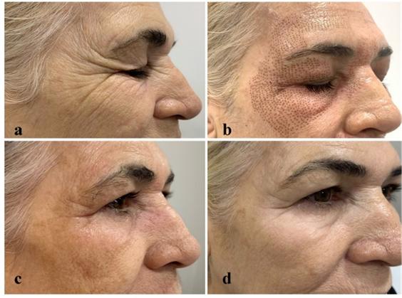 Participant SG (a) Before (b) After ablation, erythema, edema and crusts (c) transient dyschromia- hyperpigmentation 15 days after ablation (d) Improvement in skin texture, attenuated wrinkles 6 months after the second session with safe needle electrode.