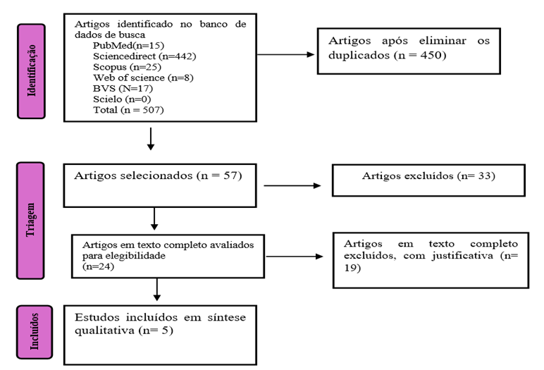 Como critérios de inclusão foram utilizados artigos em inglês e português, estudos primários, que realizaram pesquisa originais com seres humanos que avaliaram a temática principal desta revisão e sem delimitação temporal. Foram excluídos estudos secundários (revisão narrativa, integrativa e sistemática), literatura cinzenta (dissertações, teses, documentos não publicados, relatórios de conferências e/ou reunião científica) e artigos que não condizem com a temática escolhida. Os dados foram coletados em um instrumento organizado contendo nome dos autores, ano, objetivo do estudo, metodologia e principais resultados. A figura 1, demonstra o processo de identificação, triagem e inclusão dos artigos.