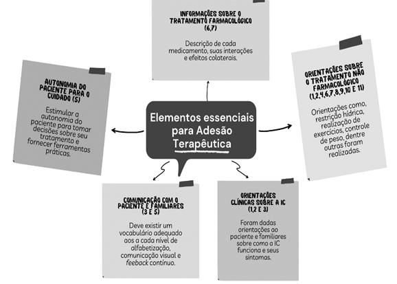 Os resultados deste estudo identificaram como principais elementos para o processo de adesão terapêutica dos pacientes com insuficiência cardíaca a aplicação da educação em saúde no que diz respeito tanto ao repasse das informações gerais pertinentes a IC, por exemplo os sinais e os sintomas, como do tratamento farmacológico e não farmacológico; o estabelecimento de uma comunicação simples para a compreensão do cliente e da sua família. Diante disso, é válido ressaltar a importância de estimular a autonomia do cliente para o desenvolvimento do seu autocuidado, garantindo o contínuo cuidado com a IC.