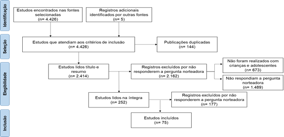 Identificaram-se um total de 4.431 produções, das quais 4.426 foram provenientes das fontes de dados selecionadas previamente (SCOPUS= 1.246; CINAHL= 137; Medline/PubMed= 2.477; Web of Science= 555; LILACS= 11) e cinco foram identificadas mediante leitura das referências das produções primárias. Desses, 2.558 atenderam aos critérios de elegibilidade propostos neste estudo. Ressalta-se que 144 trabalhos foram excluídos por duplicação nas bases de dados, enquanto que os demais passaram pelo processo de leitura de título e resumo que resultou na exclusão de 2.162 produções por não responderem à pergunta norteadora. Os 252 estudos remanescentes foram submetidos a etapa de leitura integral, resultando na inclusão de 75 artigos, como descrito na Figura 1.