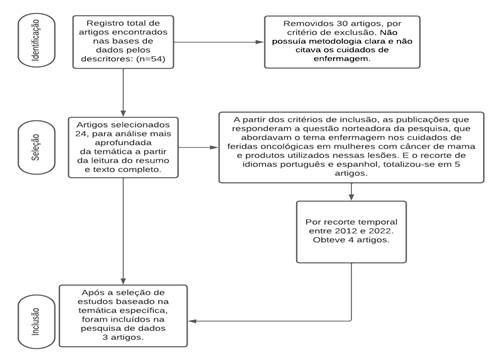 Após a pesquisa com o descritor principal “feridas neoplásicas AND neoplasia da mama” foram encontrados 54 artigos, os artigos de revisão sem metodologia clara, os que não especificaram os cuidados de enfermagem foram excluídos. Diante disso, a bibliografia passou a ser composta por 24 artigos, com vistas a uma análise mais aprofundada da temática, a partir da leitura do resumo e texto completo e baseando-se nos critérios de inclusão e exclusão, a bibliografia potencial constitui-se de três produções científicas.