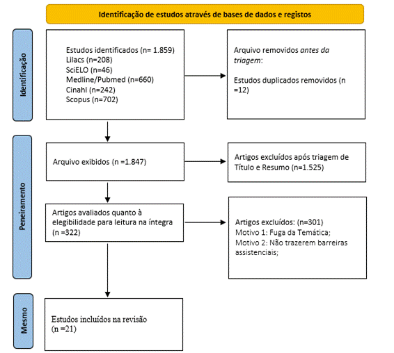 Após a realização das buscas nas bases de dados, e aplicação dos filtros para inclusão e exclusão, foram encontrados 1.859 estudos que estariam possivelmente relacionados com a questão de pesquisa proposta. Posteriormente, os artigos foram analisados no programa Rayyan, onde foi realizada a exclusão por título e resumo por dois dos autores e caso houvesse divergência um terceiro autor também participava da análise, resultando num total de 322 artigos para leitura completa. Em seguida observou-se com a leitura na íntegra que apenas 21 estudos se enquadraram nos critérios pré-definidos e passaram a compor a amostra final a ser discutida nesse estudo.