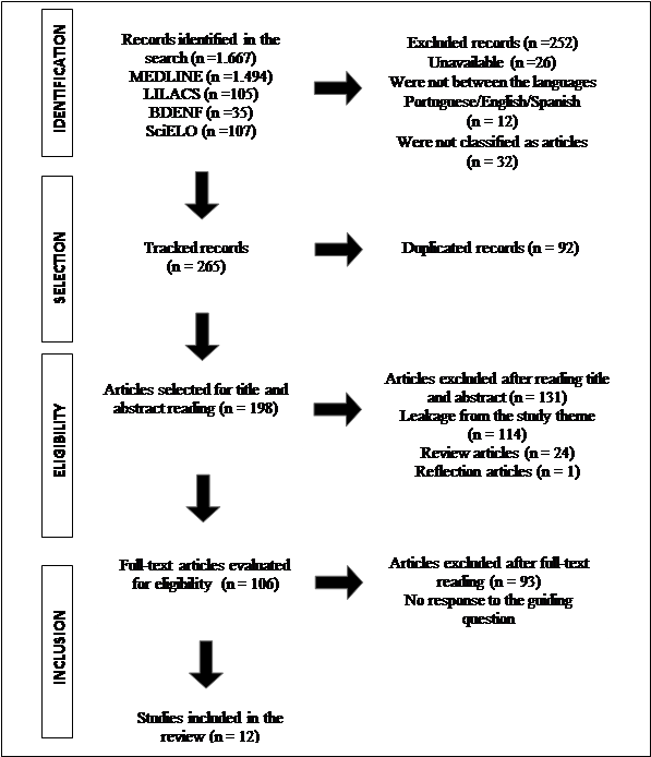 To search for articles, the following databases were selected: Latin American and Caribbean Literature on Health Sciences Information (LILACS), Nursing Database (BDENF), Medical Literature Online (MEDLINE), and the electronic library Scientific Electronic Library Online (SciELO).