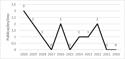 Figura 2 - Número de estudos primários em cada ano relativo ao período de tempo delimitado (2010 a 2020).