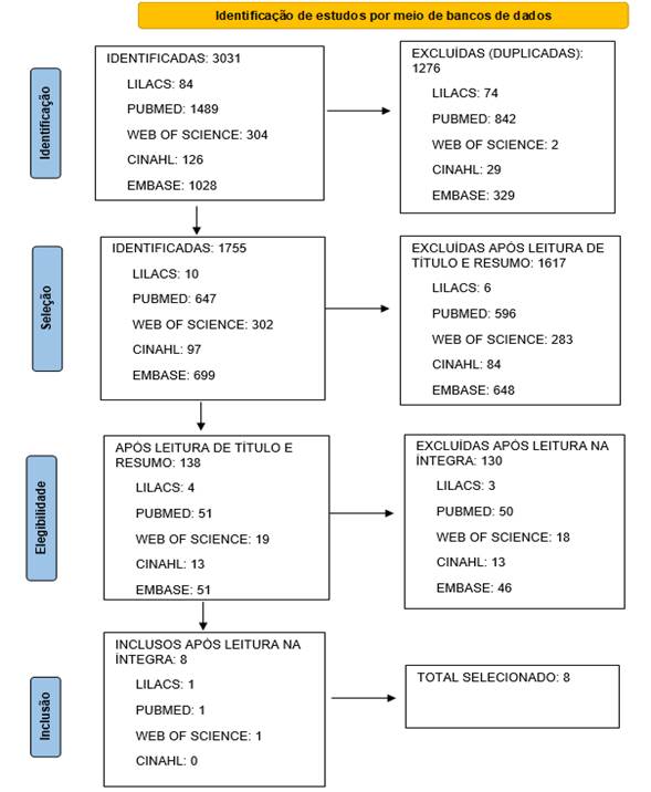 Figura 1 - Fluxograma elaborado de acordo com a Identificação de estudos por meio de banco de dados, seleção, elegibilidade e inclusão dos estudos na Revisão Integrativa
