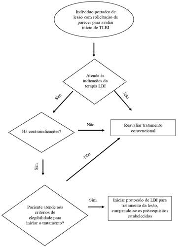 Esse fluxo de elegibilidade para uso de LBI no tratamento de lesões por pressão e úlceras diabéticas foi criado para auxiliar os enfermeiros capacitados em LBI a indicarem ou contraindicarem o uso da tecnologia e para se estabelecerem os requisitos necessários à aplicação nos usuários com indicação de uso da terapia.