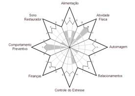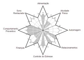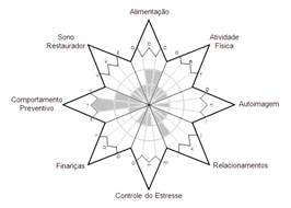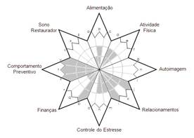 The main demands in the dimensions of food, physical activity, self-image, relationships, finances and restorative sleep were identified. As a product, a visual image of the lifestyle profile was generated, in which it is possible to observe the most fragile areas and those with the greatest potential, which can be seen in the figure below (FIGURE-01).