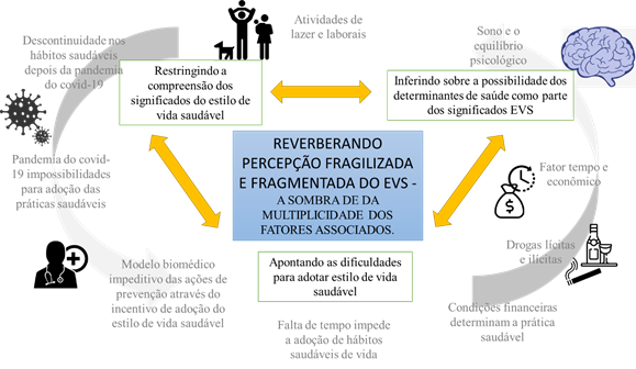─ Mencionando que as condições financeiras determinam a prática saudável; ─ Compartilhando que a falta de tempo impede a adoção de hábitos saudáveis de vida; ─ Informando que o modelo biomédico impede as ações de prevenção por meio do incentivo a adoção do EVS; ─ Descobrindo, na pandemia da doença do coronavírus (COVID-19), impossibilidades para adoção das práticas saudáveis; ─ Mostrando a descontinuidade dos hábitos saudáveis depois da pandemia da COVID-19. |