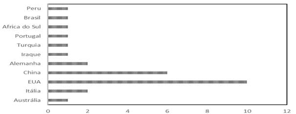 Figura 2 - Distribuição do país de publicação dos artigos incluídos na amostra. Natal, RN, 2022.