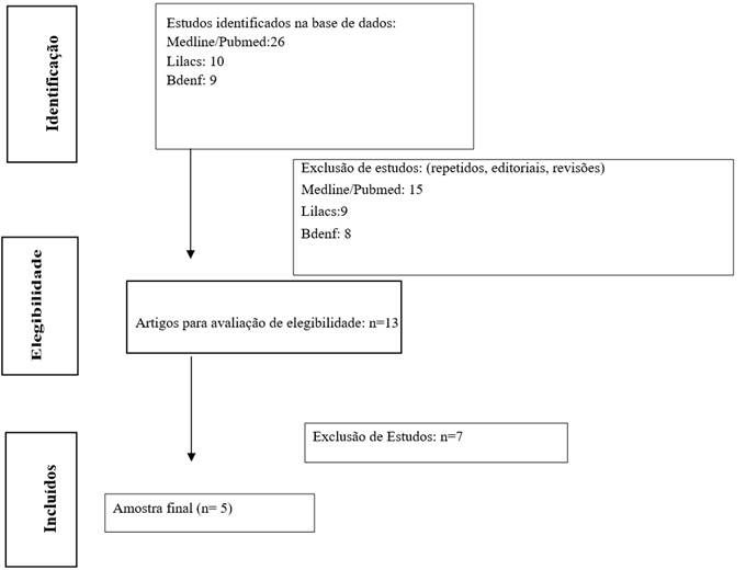 Encontraram-se, numa primeira triagem, 45 artigos (MEDLINE/PUBMED: 26; LILACS: 10; BDENF: 9); os quais foram submetidos à leitura de títulos e resumos, com objetivo de refinar a busca. Destes, foram excluídos 10 artigos que apresentavam outras intervenções para a promoção da saúde de adolescentes com diabetes mellitus I, estudos que abordaram tecnologias de maneira geral (n= 5), estudos focados em outros profissionais da saúde (n=4), estudos que não eram focados na saúde dos pacientes (n=12), estudos repetidos (n=1). A amostra final foi composta por cinco estudos. O fluxograma relativo à busca dos artigos nas bases de dados e seleção final dos artigos foi descrito pelo fluxograma PRISMA(13) e está apresentado na Figura 1.