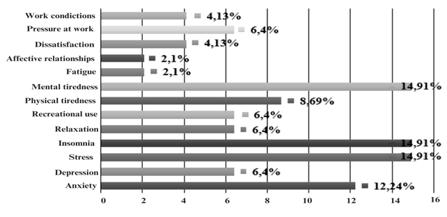 Other health problems were cited by the participants, with emphasis on physical fatigue and stress. Nursing work favors exposure to workloads, whether physical or mental, which cause, as consequences, damage to the worker's health. It is possible to state that the symptoms of stress can be considered risk factors for the consumption of alcohol and other licit and illicit drugs(16).