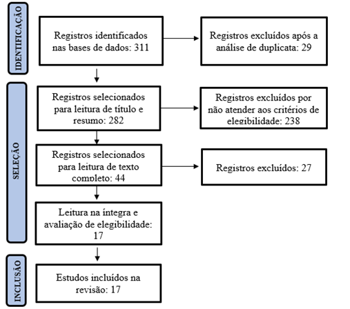 Foram selecionados para leitura na íntegra 44 artigos. Depois da leitura completa, 12 artigos foram excluídos por não responder à questão de pesquisa e 15 artigos foram excluídos por não serem estudos originais. Assim, 17 artigos foram considerados elegíveis para compor a amostra da revisão integrativa, conforme o Fluxograma 1.