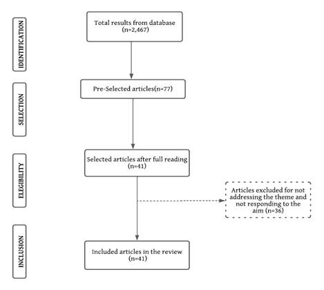 Subsequently, 77 articles were selected for reading in full, based on reading the title and abstract and applying the inclusion and exclusion criteria. Finally, after reading in full, 41 were selected to compose the sample. These were organized and presented through tables. Sample values in percentages were obtained using formulas in Microsoft Excel.