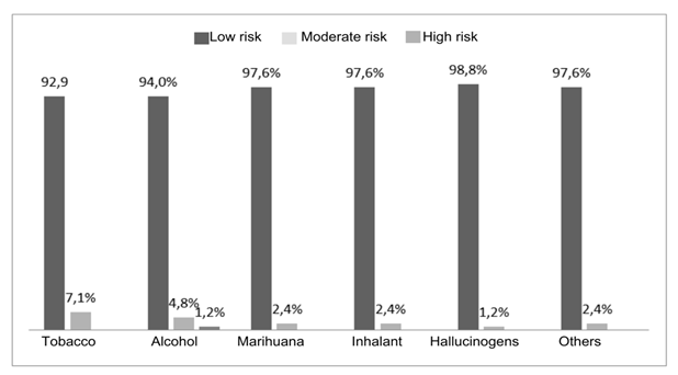 With regard to consumption patterns, in general, participants showed low risk for a significant portion of SPA specimens. The following exceptions stand out: tobacco (7.1%), alcohol (4.8%), marijuana (2.4%) and inhalants (2.4%), which showed levels compatible with moderate risk consumption, as demonstrated in Graph 1.