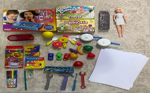 Para a realização das brincadeiras junto a família e a criança no hospital, cada acadêmica de enfermagem recebeu, da professora coordenadora do projeto, um kit (Figura 1) contendo os seguintes materiais e brinquedos: jogo da velha, dominó, quebra-cabeça, jogo da memória, uma boneca, uma bola, três carrinhos, um ônibus, uma mola maluca, utensílios domésticos, ferramentas, lápis de cor, lápis grafite, apontador, massa de modelar, giz de cera e folhas A4. Ressalta-se que a foi assegurado que todos os brinquedos tivessem a garantia do Instituto Nacional de Metrologia, Qualidade e Tecnologia (INMETRO); já o lápis de cor e grafite, massa de modelar e giz de cera, continham em suas embalagens selo de não toxicidade.