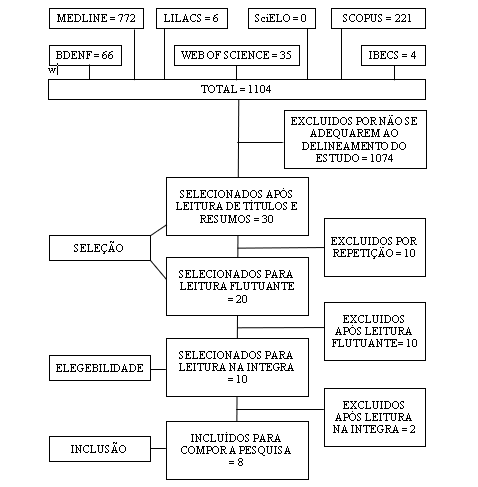 Nesse processo, os artigos duplicados entre bases de dados e repetidos entre os selecionados foram identificados, tendo sido realizada a seleção definitiva das referências elegíveis para leitura na íntegra. Assim, a amostra final foi composta por oito artigos.