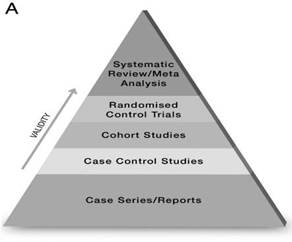 Os estudos foram avaliados a partir do modelo metodológico da pirâmide de evidência científica proposto pelos autores(15). A organização da pirâmide acontece através da hierarquização dos estudos, portanto estudos que estiverem no topo da pirâmide apresentam uma maior evidência do que os estudos posicionados na base.