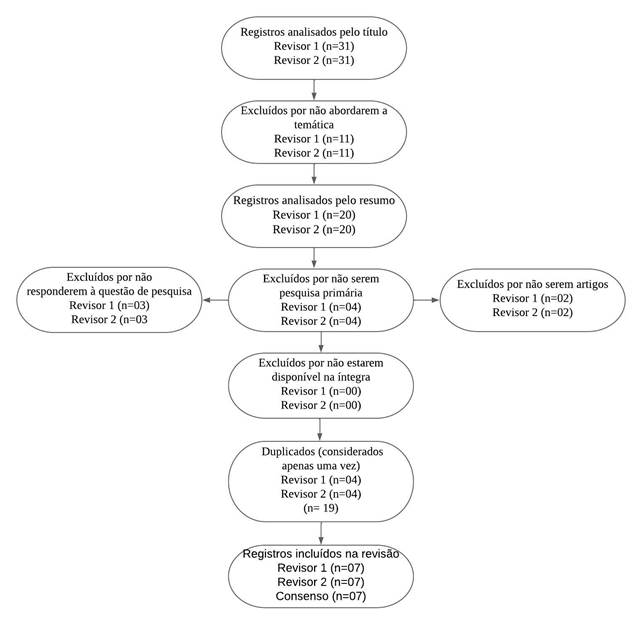 A busca nas bases de dados LILACS, SCOPUS e no Portal SCIELO capturou 31 referências. Após a leitura dos títulos e resumos, com o intuito de selecionar os que tratavam do tema de interesse, foram selecionados sete estudos para leitura na íntegra. O período de publicação dos artigos foi entre 2008 e 2021, sendo um em 2008, 2011, 2016, 2017, 2018, 2019 e 2021, respectivamente.