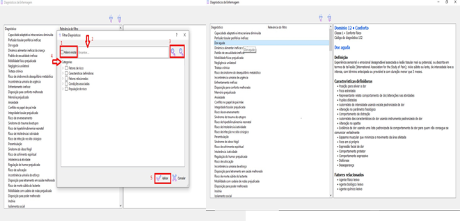 A interface do software pode ser visualizada na Figura 1. Ao abrir o software é possível visualizar os filtros na parte superior esquerda: um filtro para busca (1) e o outro para cancelar a busca anterior (2), além dos Diagnósticos de Enfermagem (3), situados no lado esquerdo da tela. Todas essas funções estão destacadas em vermelho.
