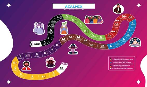O jogo denominado “Acalmix” é composto por um tabuleiro retangular que contém 44 casas, um dado de seis lados, cinco peões de diferentes cores que representam os jogadores, 63 cartas contendo perguntas e mensagens temáticas, além de um guia para orientação do aplicador. O jogo permite de um a cinco participantes com a presença de um juiz. As cartas são divididas em oito blocos de diferentes cores em que cada bloco faz referência a um passo da técnica A.C.A.L.M.E.-S.E (16).