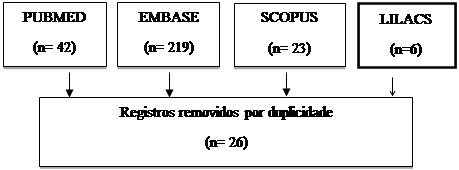 A coleta de dados foi realizada no período de agosto a dezembro de 2021 nas bases de dados: SCOPUS, Medical Literature Analysis (PUBMED/ MEDLINE) e EMBASE e Literatura Latino Americana e do Caribe em Ciências e Saúde (BVS/LILACS). Na busca foram utilizados os descritores em Ciência da Saúde (DeCs), Emtree e palavras-chave, que foram combinados de forma diferente, utilizando os operadores booleanos AND e OR, para favorecer a amplitude da busca dos estudos (Quadro 1).