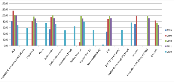 Figura 1 – Coberturas Vacinais por Imunobiológico segundo Ano - Alagoas, 1995, 2000, 2010, 2011, 2020.