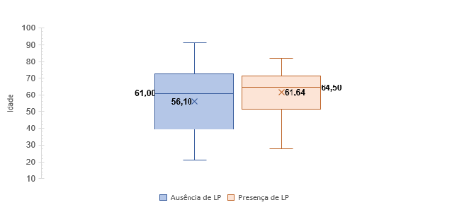 A Figura 1 apresenta a média e mediana de idade dos pacientes, evidenciando que a média de idade daqueles que não desenvolveram LPP foi de 56,1 anos (DP: 20,92), e dos que apresentaram LPP foi de 61,64 anos (DP:14,76). Comparando-se as medianas, observa-se que 50% dos pacientes que não apresentaram LP tinham idade abaixo de 61 anos e os outros 50% tinham acima de 61 anos. Dentre os pacientes com LPP, 50% tinham até 64 anos e os outros 50% possuíam acima de 64 anos. A diferença nas medianas foi de três anos e meio, mostrando uma correlação positiva fraca entre a presença de LPP e uma maior idade nos pacientes.