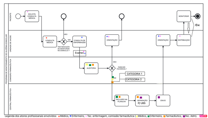 Figura 1 - Diagrama de Business Process Management (BPM) do programa de monitoramento glicêmico domiciliar, semestralmente, por paciente. Londrina, PR, Brasil, 2023 (n=659)
