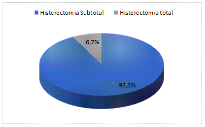 A histerectomia subtotal foi a técnica cirúrgica utilizada em 93,3% das pacientes o que corresponde a 14 delas, já a histerectomia total em apenas 6,7%, ou seja, em apenas1 mulher conforme observado no gráfico 2.