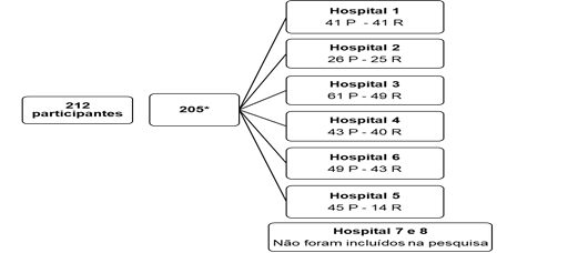 Dois hospitais (7 e 8), pertencentes a região do estudo, não aceitaram participar da pesquisa e por isso foram excluídos.