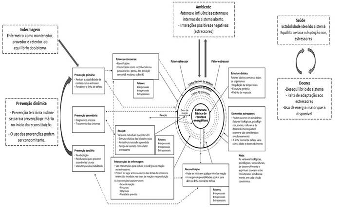 A apresentação do diagrama realça a compreensão da teoria, evidencia-se a presença de dois grandes componentes da teoria que são o estresse e a reação ao mesmo, esses componentes estão dispostos de maneira clara no diagrama, sendo elucidados na dinâmica das variáveis fisiológicas, psicológicas, socioculturais, desenvolvimentistas, espirituais, estrutura básica e recursos de energia, linhas de resistência, linha normal de defesa, linha flexível de defesa, estressores, reação, prevenção primária, secundária e terciária, fatores interpessoal. No entanto, observa-se que a presença gráfica de alguns elementos fundamentais no diagrama como o continuum saúde-doença, enfermagem e o ambiente, poderia facilitar a compreensão das interações das variáveis com esses elementos ditos fundamentais (Figura 2).