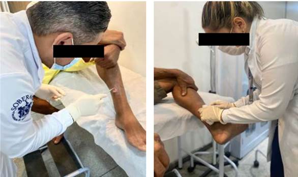 A população assistida durante a permanência dos estudantes no serviço, foi composta por 02 pacientes, sendo 01 acamado. Ambos com histórico de diabetes mellitus. Suas lesões eram oriundas de trauma e pressão em proeminência óssea.