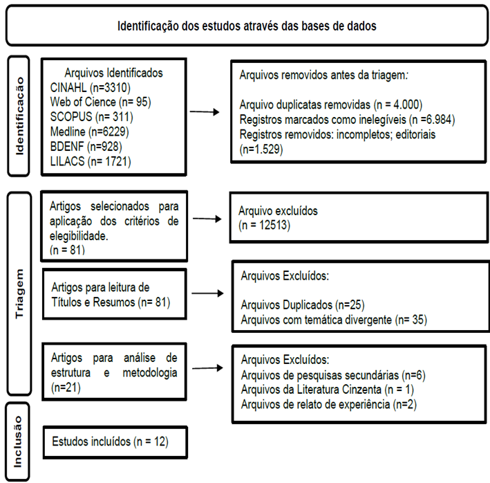 A busca dos estudos deu-se nas bases de dados Medical Literature Analysis and Retrieval System Online (MEDLINE), Literatura Latino-Americana e do Caribe em Ciências da Saúde (LILACS), Base de Dados em Enfermagem (BDENF), Cumulative Index to Nursingand Allied Health Literature (CINAHL), SCOPUS e Web of Science.