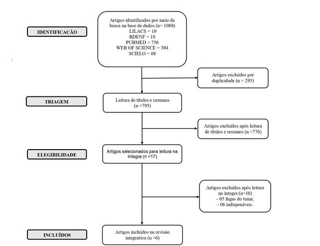 Na etapa de seleção, utilizou-se o Software Rayyan para armazenamento, organização dos artigos, e exclusão dos duplicados. Foram identificados 1088 estudos primários, dos quais 295 foram excluídos por serem duplicatas, e 793 após a leitura dos resumos. Além de dois revisores independentes, também houve a participação de um juiz na análise e seleção dos estudos. Após essa triagem, 17 estudos foram selecionados para leitura na íntegra. Destes, seis foram escolhidos para análise e síntese. A estratégia de seleção dos artigos está apresentada na Figura 1, seguindo as recomendações do grupo PRISMA(8).