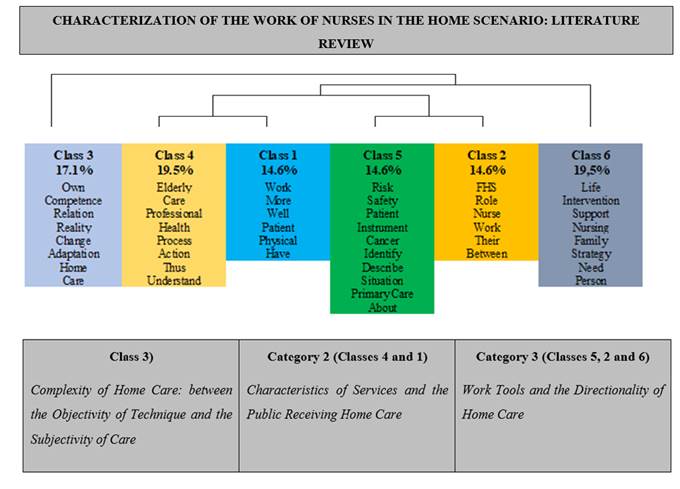 In relation to the DHC, the processing obtained a total of 58 TS, of which 47 were classified, generating an 81% use and a partition into 6 classes. This research considered the words evoked with significance in the classes. From the processing of DHC and lexicography presented by the word cloud, three interpretative categories could be constructed that respond to the characterization of the work of nurses in the home setting.