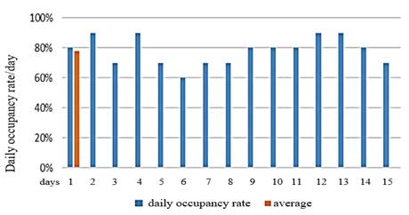 An intensive pace of nursing activities was observed, adjusting staffing to the daily patient demand. Between the days of the research, the occupancy rate varied between 60% and 90% of the total ICU capacity, with an overall average of 78% bed occupancy during the period. On 9 of the 15 data collection days, the occupancy rate reached 80% or more, allowing a fairly approximate assessment of the maximum nursing work capacity in the sector. On no day were the beds fully occupant, as can be seen in Graph 1.