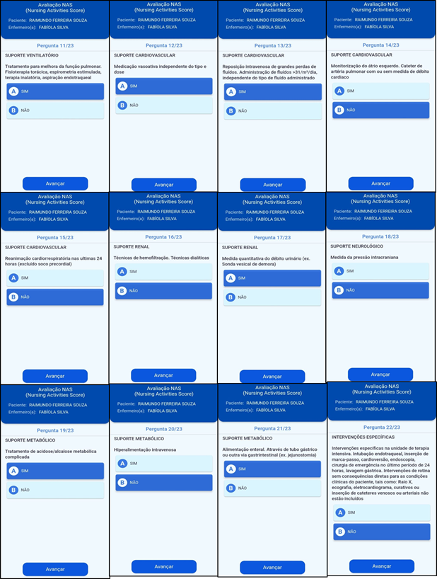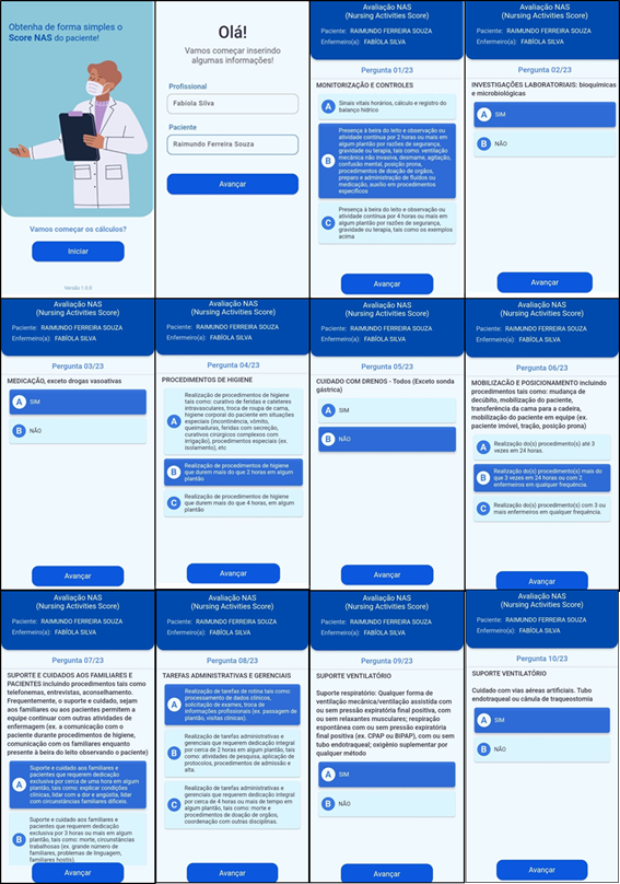 Screen 1: program presentation screen with start key; Screen 2: fill in the names of the professional and patient, press next key; Screen 3: NAS question 1: monitoring and controls, alternatives A, B and C; Screen 4: NAS question 2: laboratory investigations, alternatives A and B; Screen 5: NAS question 3: medication, except vasoactive drugs, alternatives A and B; Screen 6: NAS question 4: hygiene procedures, alternatives A, B and C; Screen 7: NAS question 5: drain care - all (except gastric tube), alternatives A and B; Screen 8: NAS question 6: mobilization and positioning, alternatives A, B and C; Screen 9: NAS question 7: support and care for family members and patients, alternatives A, B and C; Screen 10: NAS question 8: Administrative and managerial tasks, alternatives A, B and C; Screen 11: NAS question 9: respiratory support, alternatives A and B Screen 12: NAS question 10: airway care, alternatives A and B; as per Figure 01: