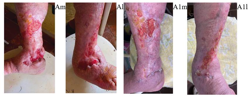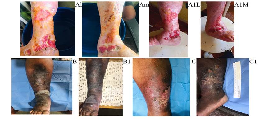 Os dados foram analisados por meio de comparação direta das fotografias, assim como variáveis relacionadas à dor (redução ou aumento), quantidade de exsudato, odor, característica do leito da lesão, assim como a medida da área da lesão.