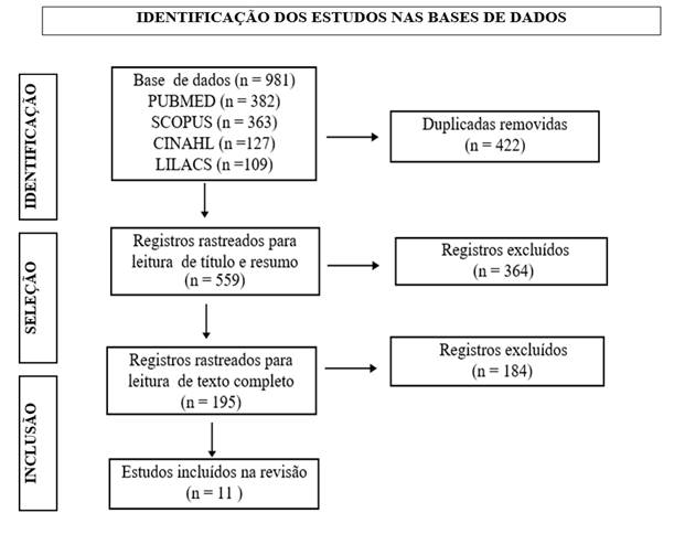 Após a busca nas bases de dados, foram identificadas 981 publicações, das quais 422 foram removidas por serem duplicadas, restando 559 estudos. Após aplicados os critérios de elegibilidade, 11 artigos foram incluídos na revisão, conforme o fluxograma Prisma(9), demonstrado na Figura abaixo.