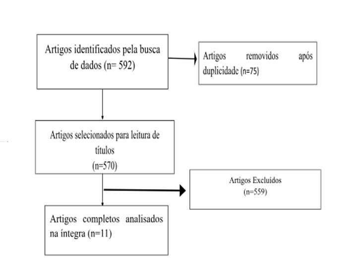 Foram identificados 592 artigos nas buscas empregadas nas bases de dados selecionadas para a condução da revisão, sendo 22 publicações excluídas por estarem duplicadas. Após a leitura de títulos, resumos e descritores, 11 artigos foram analisados na íntegra devido atenderem os critérios de inclusão. Na Figura 1 são apresentadas as etapas da seleção dos artigos.