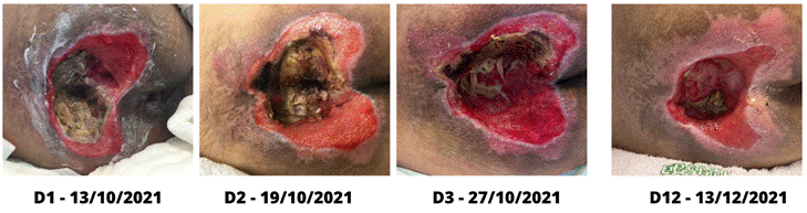 No terceiro dia de tratamento (D3 da Figura 1), em 27 de outubro, observou-se uma melhora nas bordas da LP, que apresentavam coloração, plana, regular e aderida. Já o leito apresentava uma diminuição da área de necrose e de esfacelo e um aumento da área de granulação brilhante. Diante desse progresso, as sessões de tratamento foram continuadas mantendo a pasta de hidrocolóide como cobertura primária, além das aplicações de FMB e PDT conforme previamente realizadas.