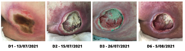 Após esta avaliação, a primeira conduta, em 24 de junho, procedeu-se à limpeza da LP, conforme protocolo. Em seguida, ocorreu a aplicação da terapia de FBM de 1 J IV nas bordas e combinado (1J de IV e 1J de V) no tecido de granulação no leito. Foi realizada a técnica de desbridamento instrumental square, na região de necrose seca, a fim de favorecer a penetração do produto enzimático escolhido. Para finalizar, foi iniciada a aplicação de creme barreira nas bordas da LP e papaína 5%, ocluindo com rayon, compressa cirúrgica estéril e fita adesiva microporosa (D1 da Figura 5).