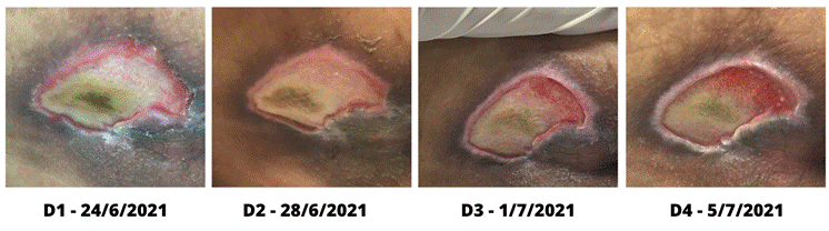 No terceiro dia de tratamento, 24 de junho, houve evidente contração de bordas, com diminuição da extensão, maior área de tecido de granulação e manifestação de melhora da dor a partir de aplicação de escala de dor.