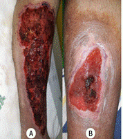 Legenda: A - lesão em face anterior da perna esquerda; B - lesão em face anterior da perna direita.