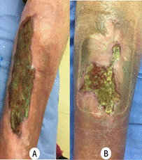 Na primeira avaliação, realizada em 20 de março de 2020, a lesão na face anterior da perna esquerda apresentava 34,5 cm de comprimento x 17,5 cm de largura (Imagem A da Figura 1), enquanto na face anterior da perna direita apresentava 14 cm de comprimento x 8 cm de largura (Imagem B da Figura 1). Ambas as lesões apresentavam exsudato abundante (≥ 70%) e sanguinolento, com bordas irregulares e planas de coloração violácea, acompanhadas de edema de 3/4+ em ambos membros inferiores. A pele perilesional exibia dermatite ocre, estava hiperemiada, sensível ao toque e também havia tecido cicatricial de queimadura prévia na área da lesão na perna esquerda.