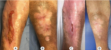 Legenda: A e B - lesão em face anterior da perna esquerda e lesão em face anterior da perna direita, respectivamente, em agosto de 2022; C e D - lesão em face anterior da perna esquerda e lesão em face anterior da perna direita, respectivamente, em janeiro de 2023.