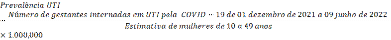 Para análise estatística, os dados foram importados para o programa R versão 4.2.0, 2022 e realizado a análise descritiva de prevalência, medidas de associação (razão de prevalência e diferença de prevalência). Em seguida calculou-se a prevalência de grávidas que foram internadas em UTI por unidade de federação (estado), utilizando o número de gestante internadas em UTI com a doença no período de um de dezembro de 2021 a nove de julho de 2022, divido por estimativas de mulheres em idade fértil que compreende mulheres de 10 a 49 anos segundo o Instituto Brasileiro de Geografia e Estatísticas(13) multiplicando por 1.000,00 utilizando a seguinte fórmula.