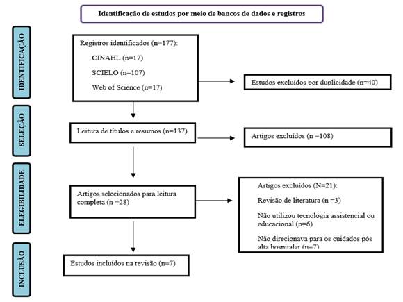 Os critérios de inclusão estabelecidos foram textos completos publicados em periódicos científicos disponíveis nas bases de dados selecionadas, estudos que apresentem o uso ou desenvolvimento de uma tecnologia para as CDTs, elaborado por profissionais de saúde que atuam na assistência a essa população que tenham sido publicados entre 2013 e 2022. O recorte temporal justifica-se pela necessidade de obter evidências atualizadas disponibilizadas na íntegra sobre a temática(17-18). Os critérios de exclusão foram artigos duplicados, artigos de revisão e artigos de opinião, assim como literatura cinzenta como dissertações e teses.